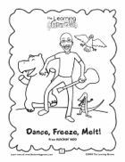 Sing & Dance (rhythm & motor coordination – toddlers & ages 3-4): Play the CD or a guitar and act out each activity. For “Freeze,” everyone freezes in place, the more funny or awkward the position the better! You can additionally have your child make funny faces while freezing. For “Melt,” slowly lower to the ground as if melting.